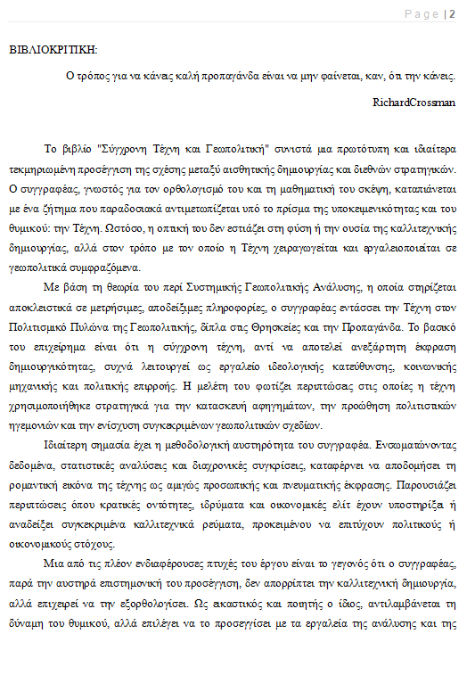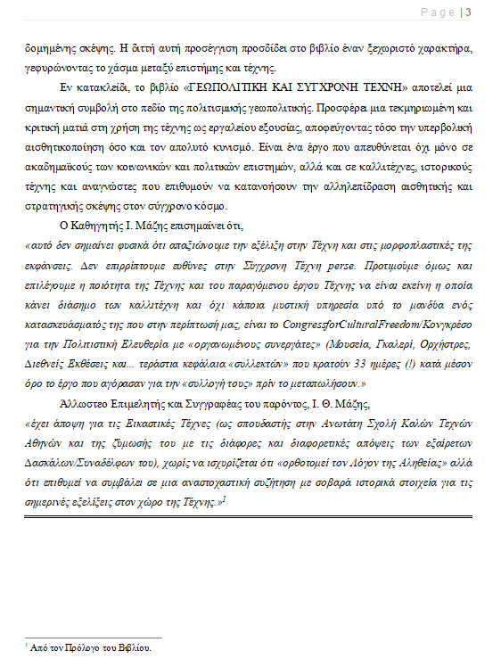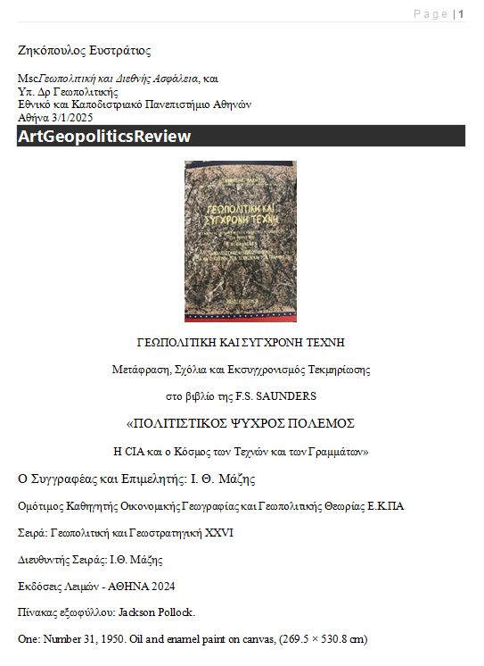 Based on his theory of Systemic Geopolitical Analysis, which relies exclusively on measurable, demonstrable data, the author incorporates Art into the Cultural Pillar of Geopolitics, alongside Religions and Propaganda. His central argument is that contemporary art, rather than being an independent expression of creativity, often functions as a tool for ideological direction, social engineering, and political influence. His study highlights cases in which art has been strategically employed to construct narratives, promote cultural hegemonies, and reinforce specific geopolitical agendas.
